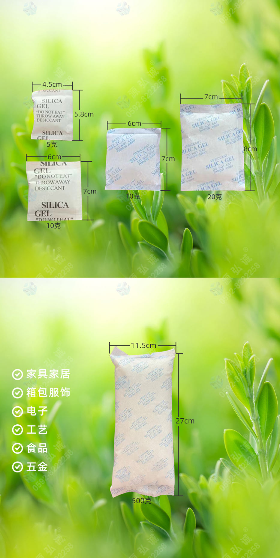 1.●硅膠干燥劑用途:?廣泛用于鞋帽,手袋,食品,醫(yī)藥,玩具,木制品,儀器,儀表,電子,計算機等物品包裝封存了密閉的空間的靜態(tài)吸附去除水分,控制相對濕度,起到防潮防霉之功效。